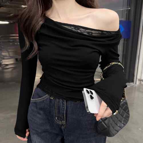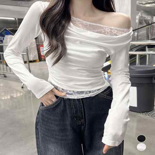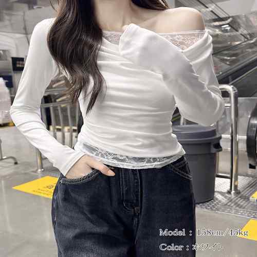 肩見せ オフショルダートップス カットソー レイヤード風 レース付き 肌見せ 大人可愛い プルオーバー おしゃれ トップス 見せるインナー女性 重ね着 シンプル