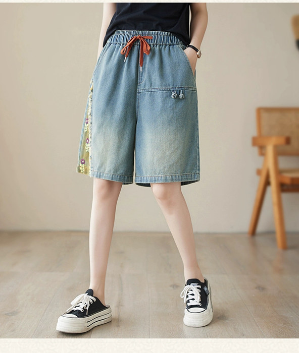 デニム ハーフパンツ ショートパンツ デニムパンツ 夏 切替え 花柄 可愛い レディース ワイドパンツ きれいめ ガウチョパンツ スカーチョ 大きいサイズ カジュアルウエストゴム ボトム バギーパンツ