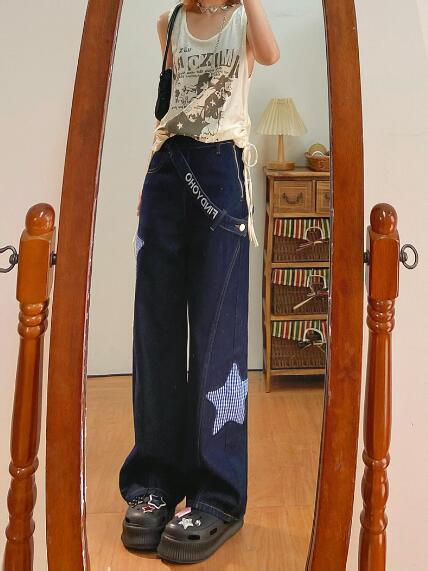 星柄ワッペンベルトジーンズジーパン パンツズボンボトムスポケットデニム太い太めダンス衣装ヒップホップHIPHOPレディースガールズストリート大きいサイズかっこいい個性的韓国ファッション