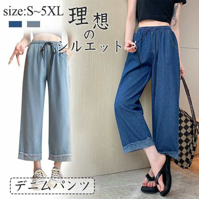 デニムパンツ レディース 春 夏 ジーンズ ワイド バギー デニム パンツ ウエスト ゴム ロングパンツワイド ウエストゴム ハイウエスト足長効 ゆったり