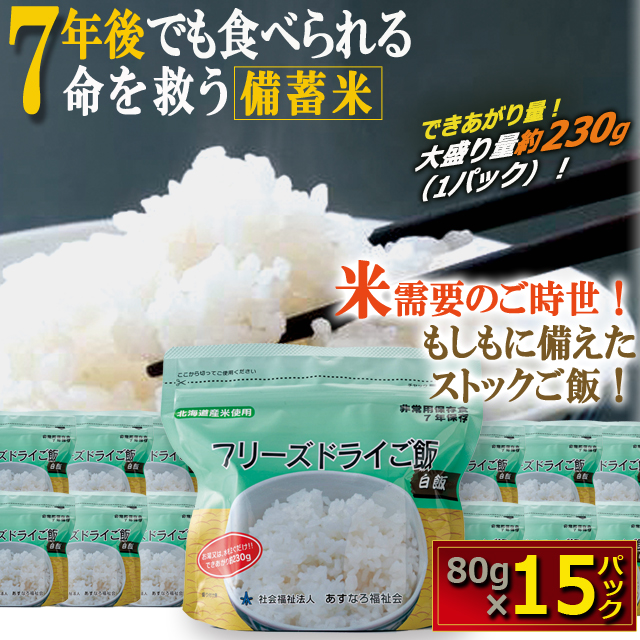 長期7年保存可能!フリーズドライご飯北海道産白飯80g×15パック 大盛り うるち米 備蓄米 停電 炊きたて 災害 非常事態 お米 アウトドア 避難