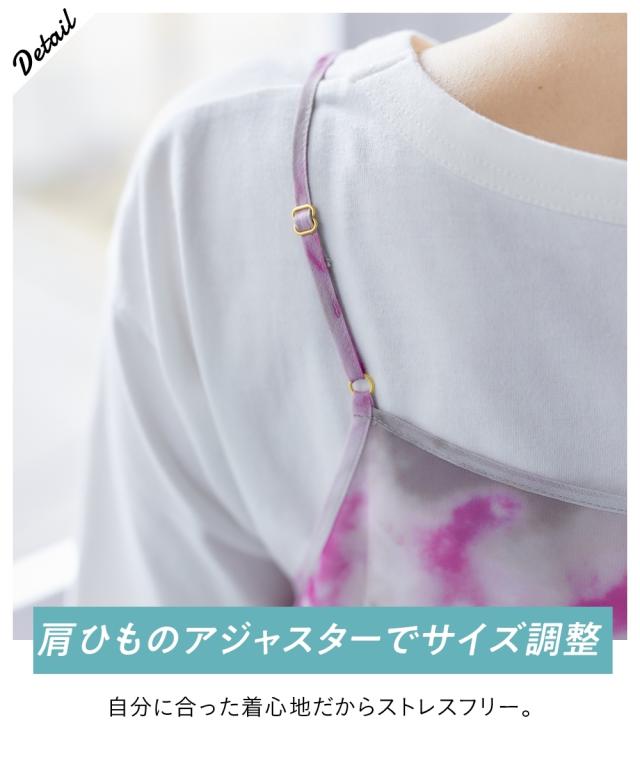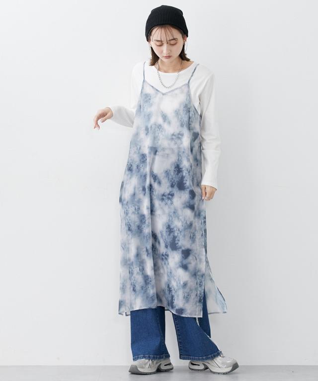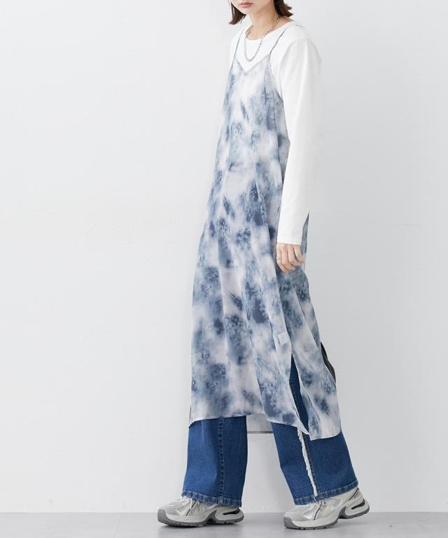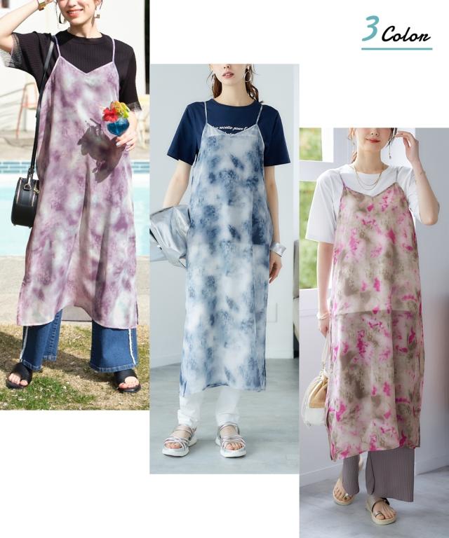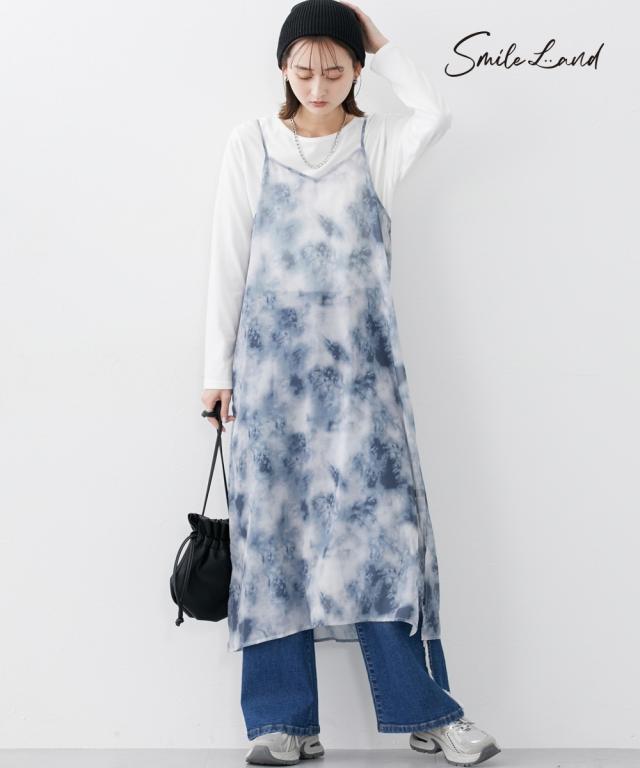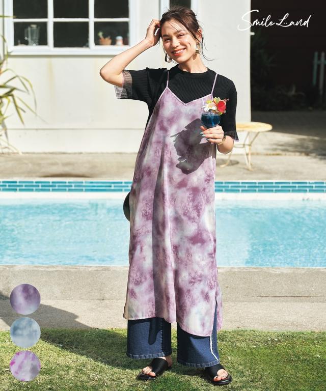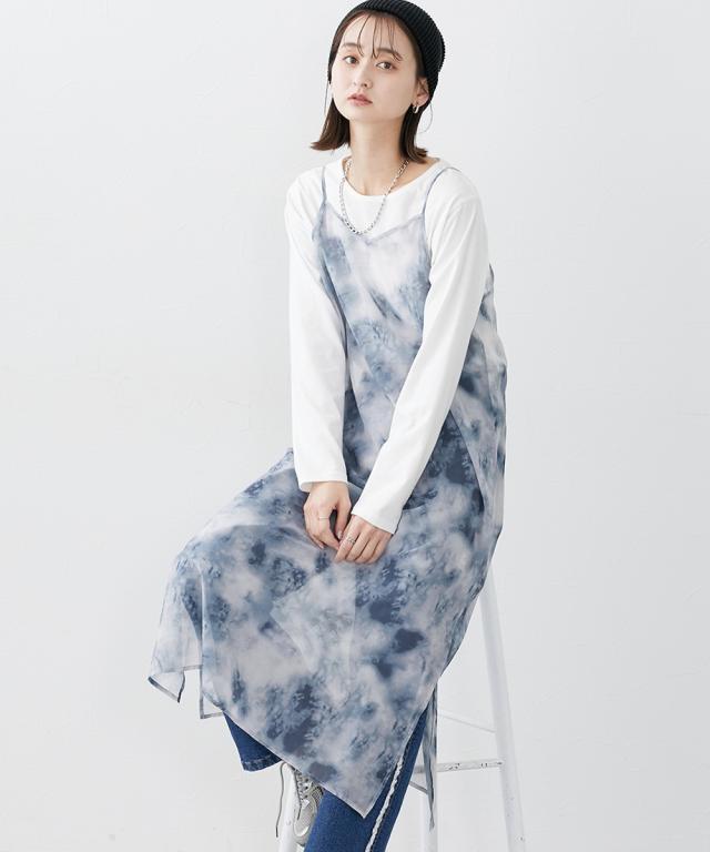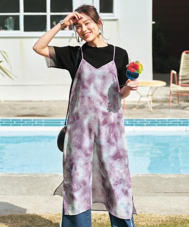 シアーなタイダイ柄ワンピで夏コーデをアップデート ■デザイン シアー素材のキャミワンピースにタイダイ柄をプリント。レイヤードスタイルに特化したデザイン、素材感にこだわりました。レイヤードすることによって、薄着の季節に気になる身体の線も隠せます。 ■素材 シアー感のあるさらっとした素材でレイヤードしても涼し気。 ■おすすめのスタイリング 普段のTシャツ、デニムコーデの上に重ねていただくと、一気に夏らしいオシャレコーデに仕上がります!