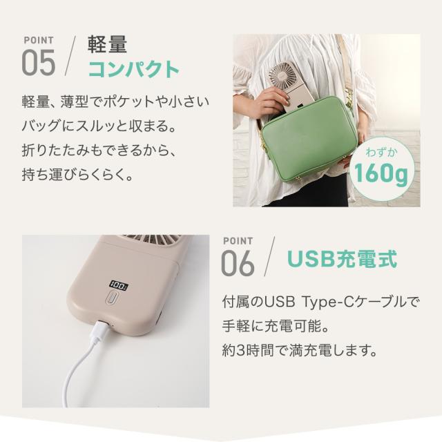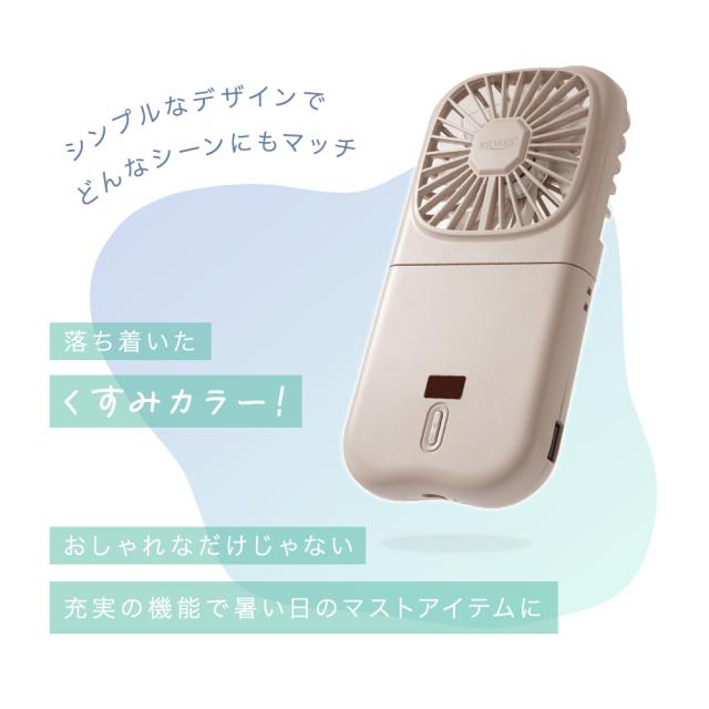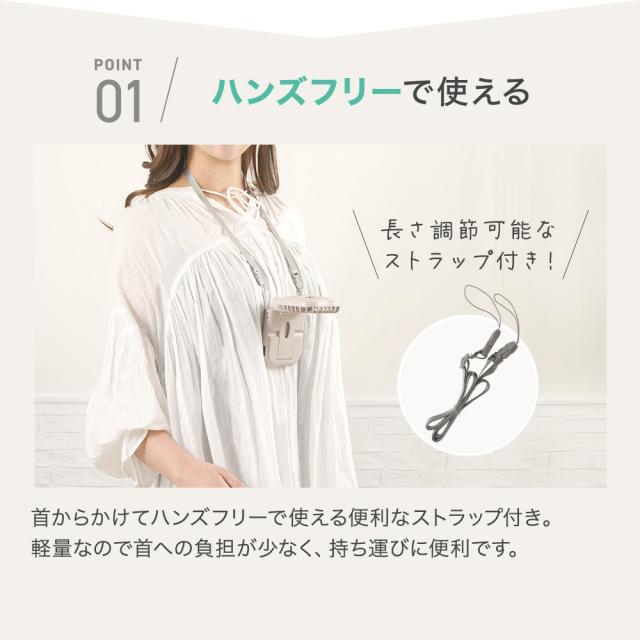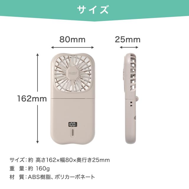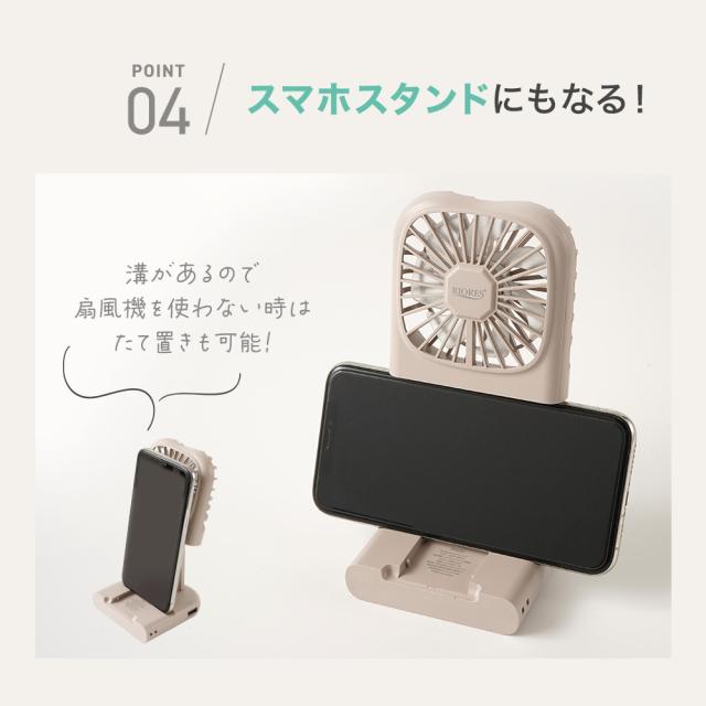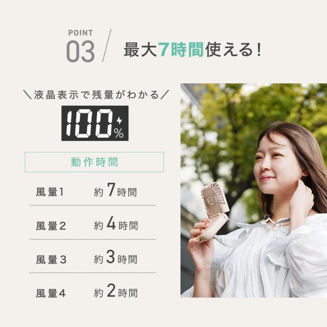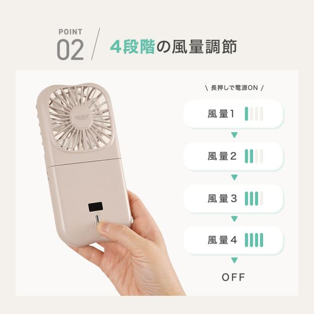 | 商品の特徴 | ハンズフリーで使える 4段階の風量調節 角度調節可能でスマホスタンドにもなる 液晶画面で充電残量が確認できる |