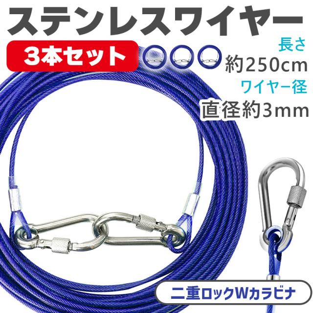 リード 犬用 係留ケーブル 3個セット ステンレス 2.5m カラビナフック 3mm 犬 ワイヤー 軽い 丈夫 しつけ用 錆び付かない リード 外飼い キャンプ 小型 中型 大型 適応 散歩 庭 屋外用