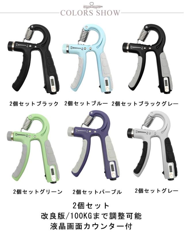 | 2個セット 改良版/100kgまで調整可能 液晶画面カウンター付 カウンター付き!ハンドグリップ 空いた時間に簡単にトレーニング♪ 約5kg?約100kgの強さに調節することができます。 絞りを時計回りに回すと強く 反時計回りに回すと弱くなります。 柔らかいTPR滑り止めがついていて、汗で滑ったりすることを軽減します。 男女ともにご使用いただけます。 また、リハビリや高齢者の方にもご使用いただけます。 | |