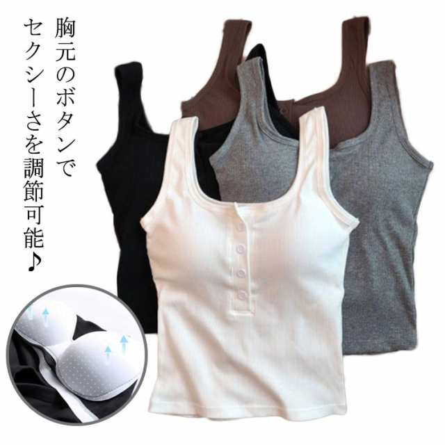タンク 美デコルテ キャミソール カップ付き レディース カップ付き トップス インナー リブ 胸元ボタン セクシー 袖なし ノースリーブ ヘンリーネック 重ね着 レイヤード ブラトップ ブラタンク おしゃれ 下着 肌着 春 夏 秋 冬