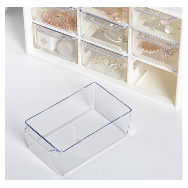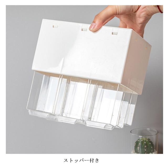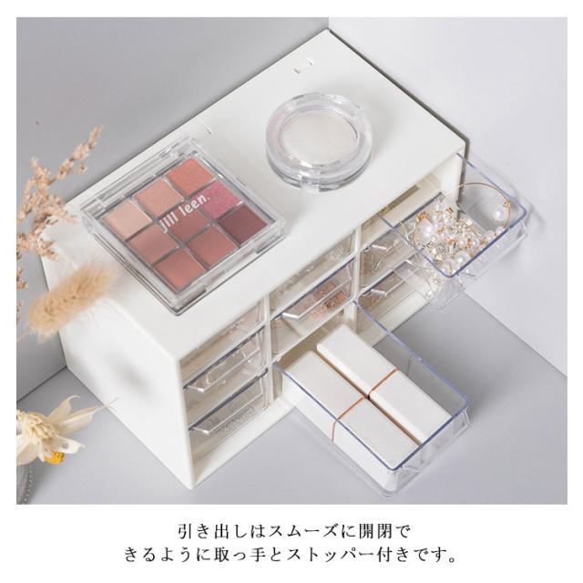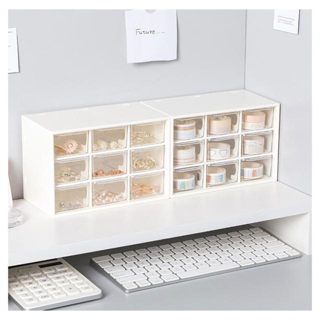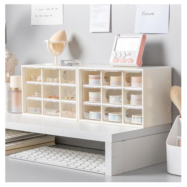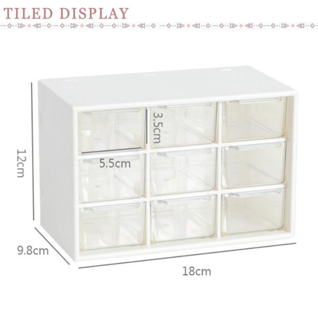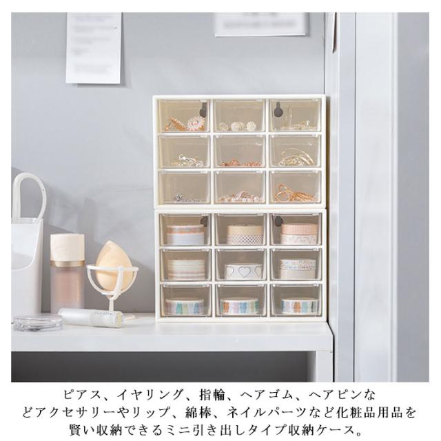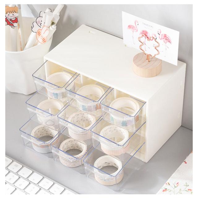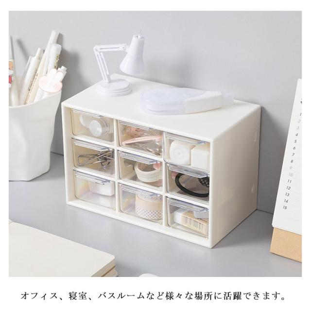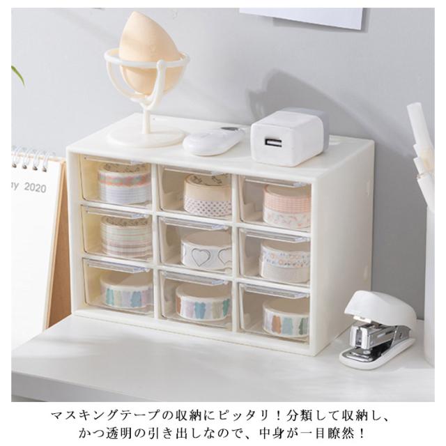 | コンパクトながら小物の整理整頓にバッチリ♪ ピアス、イヤリング、指輪、ヘアゴム、ヘアピンなどアクセサリーやリップ、綿棒、ネイルパーツなど化粧品用品を賢い収納できるミニ引き出しタイプ収納ケース。 マスキングテープの収納にピッタリ!分類して収納し、かつ透明の引き出しなので、中身が一目瞭然! 引き出しはスムーズに開閉できるように取っ手とストッパー付きです。 オフィス、寝室、バスルームなど様々な場所に活躍できます。 | |