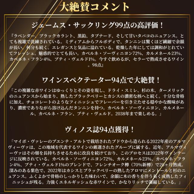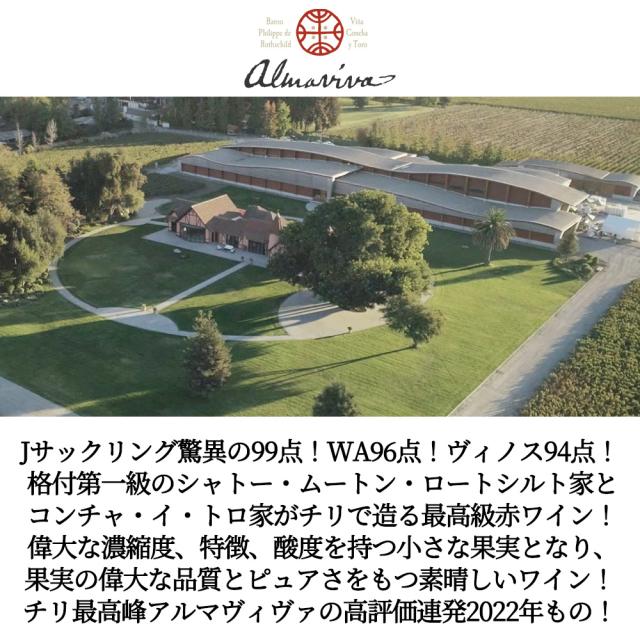 Jサックリング驚異の99点!WA96点!ヴィノス94点!格付第一級のシャトー・ムートン・ロートシルト家とコンチャ・イ・トロ家がチリで造る最高級赤ワイン!偉大な濃縮度、特徴、酸度を持つ小さな果実となり、果実の偉大な品質とピュアさをもつ素晴しいワイン!チリ最高峰アルマヴィヴァの高評価連発2022年もの!