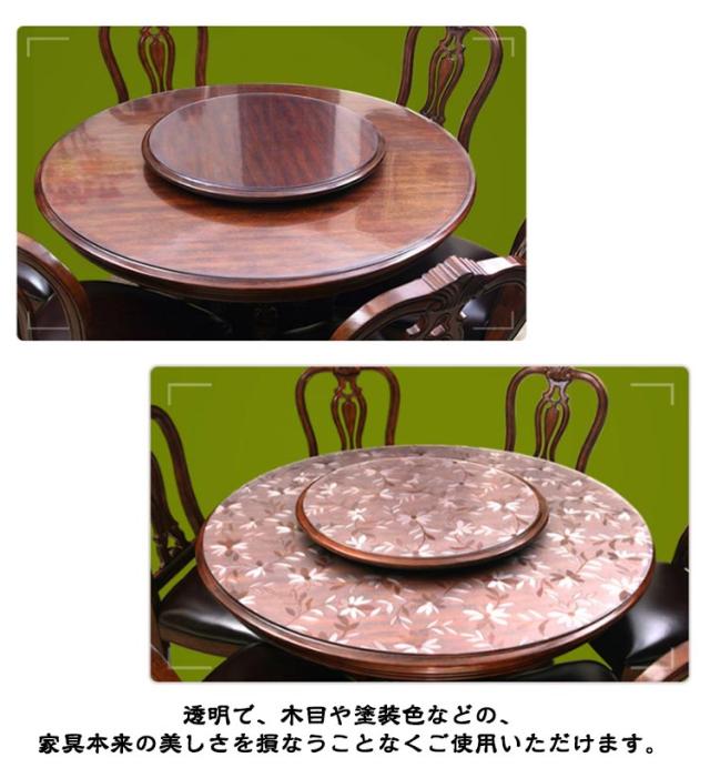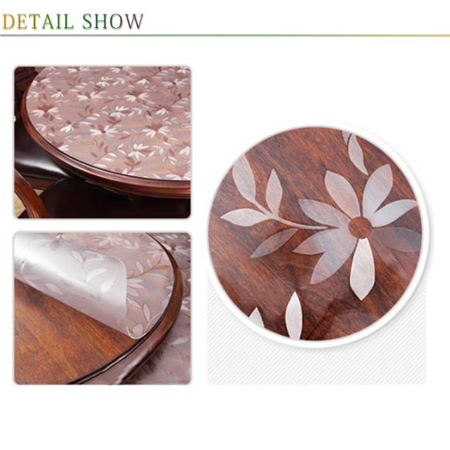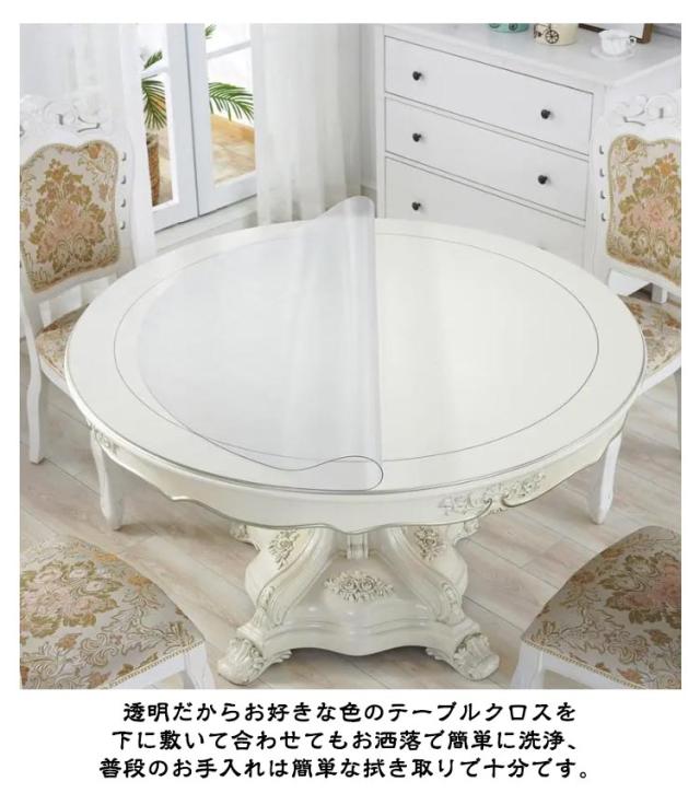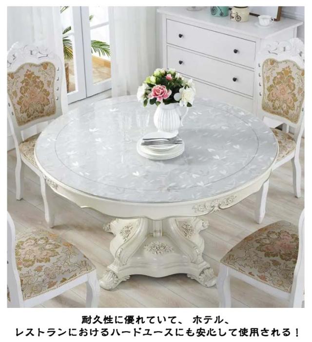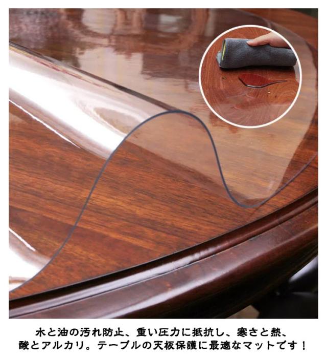 | 【テーブルマット】【直径:80cm/90cm/100cm/110cm/120cm】 大切なテーブルを傷・汚れから保護します 新品透明PVCテーブルクロス、シンプルで明るいお部屋を彩ります! 透明で、木目や塗装色などの、家具本来の美しさを損なうことなくご使用いただけます。 お子様がいる家庭は、食べこぼしや汁物こぼれも安心! 透明だからお好きな色のテーブルクロスを下に敷いて合わせてもお洒落で簡単に洗浄、普段のお手入れは簡単な拭き取りで十分です。 水と油の汚れ防止、重い圧力に抵抗し、寒さと熱、酸とアルカリ。テーブルの天板保護に最適なマットです! 耐久性に優れていて、 ホテル、レストランにおけるハードユースにも安心して使用される! | |