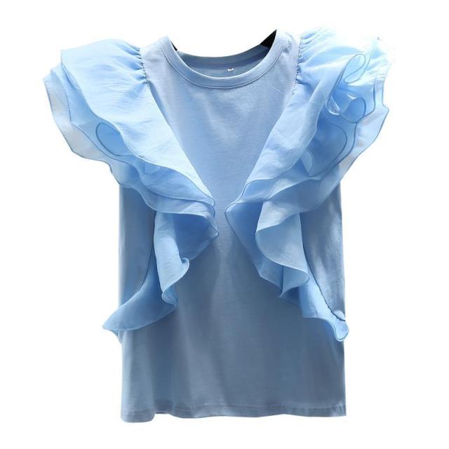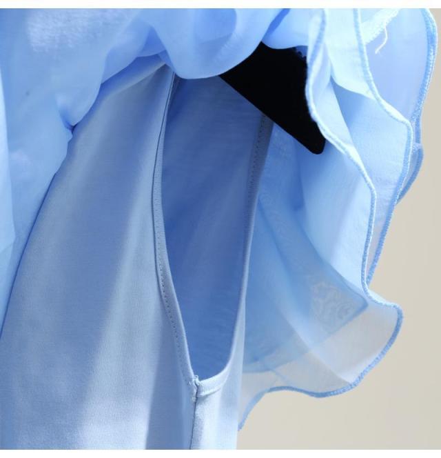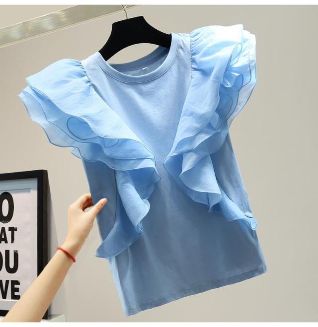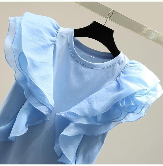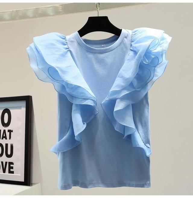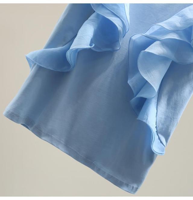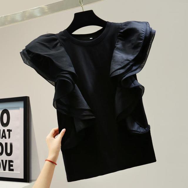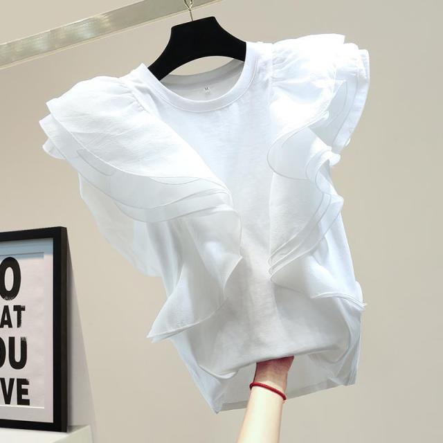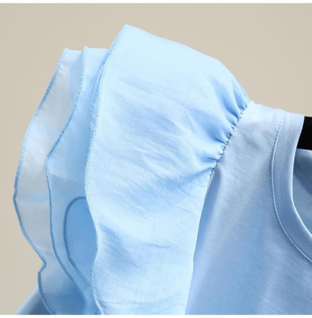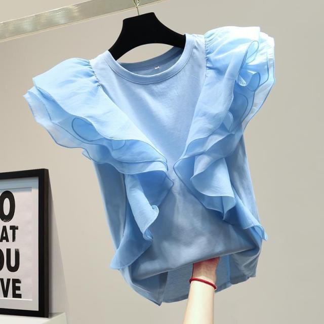 シフォン レイヤードフリルブラウス ブラウス 袖フリル ノースリーブ フリル トップス レディース クールネック 着痩せ カジュアル 通勤 OL ゆったり 体型カバー 大人 韓国 ファッション 同窓会 結婚式 パーティー フレンチスリーブ 半袖 送料無料