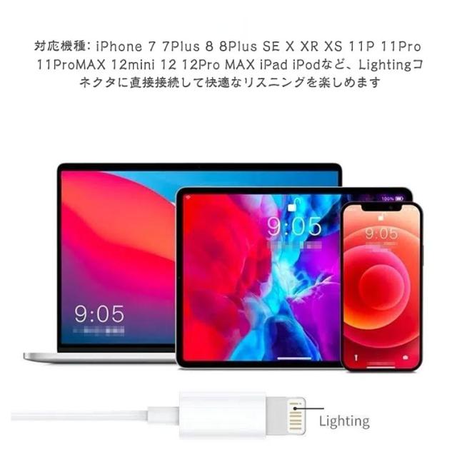| サイズについての説明 | 対応機種:iPhone7 iPhone7Plus iPhone8 iPhone8Plus iPhone11Plus iPhone11Pro 11ProMAX 12mini iPhone12 12Pro iPodなど、Lightingコネクタに直接接続して快適なリスニングを楽しめます。 |
