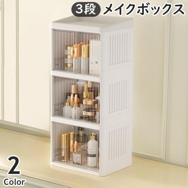 メイクボックス 3段 3層 コスメボックス 化粧品収納 折りたたみ式 扉付き 両開き クリア つまみ 卓上 机上 小物収納 スキンケア メイク道具 大