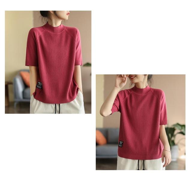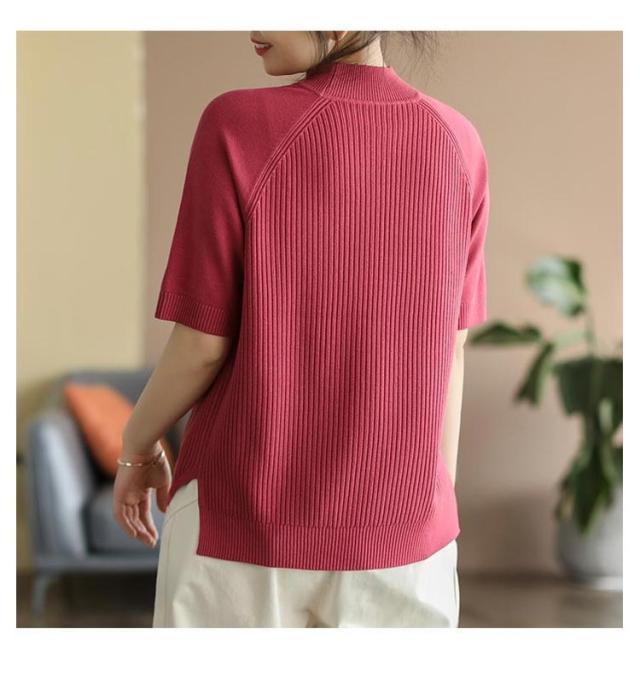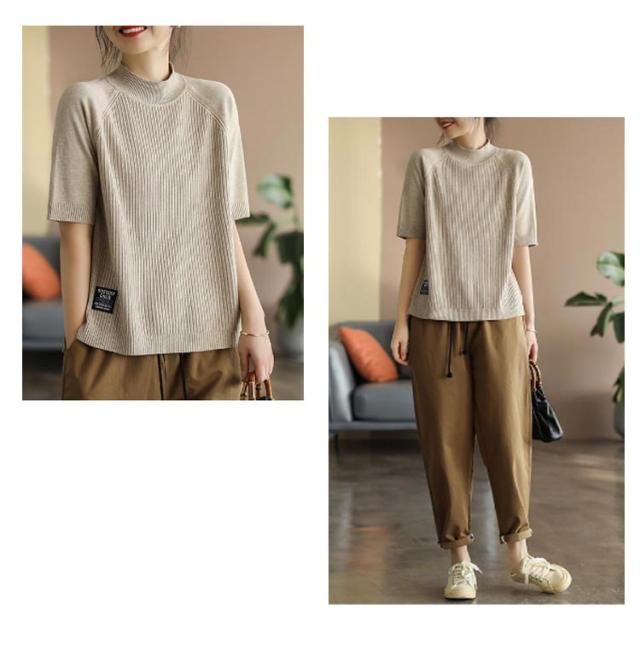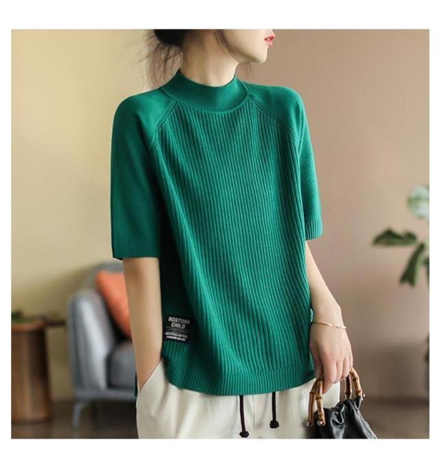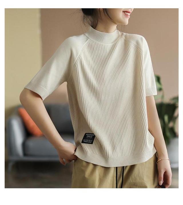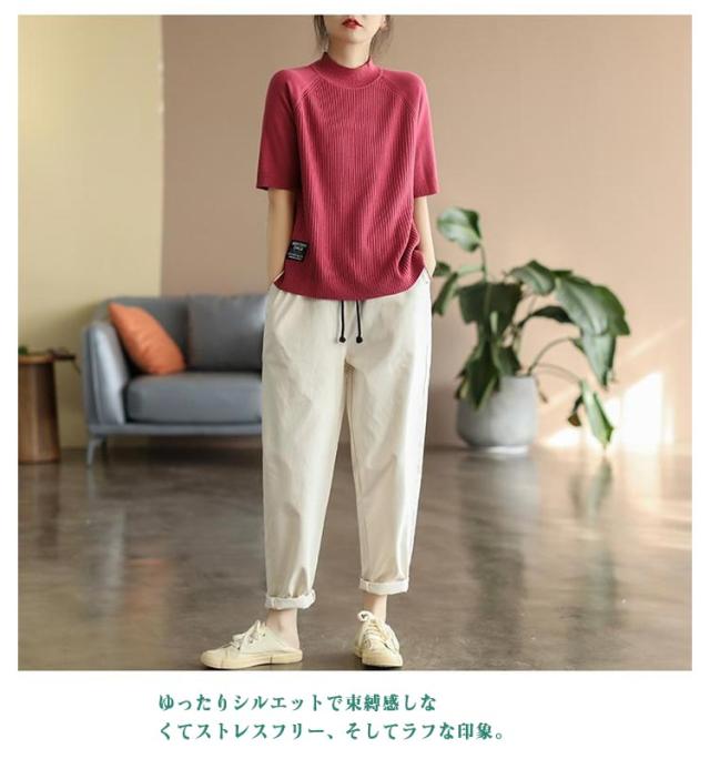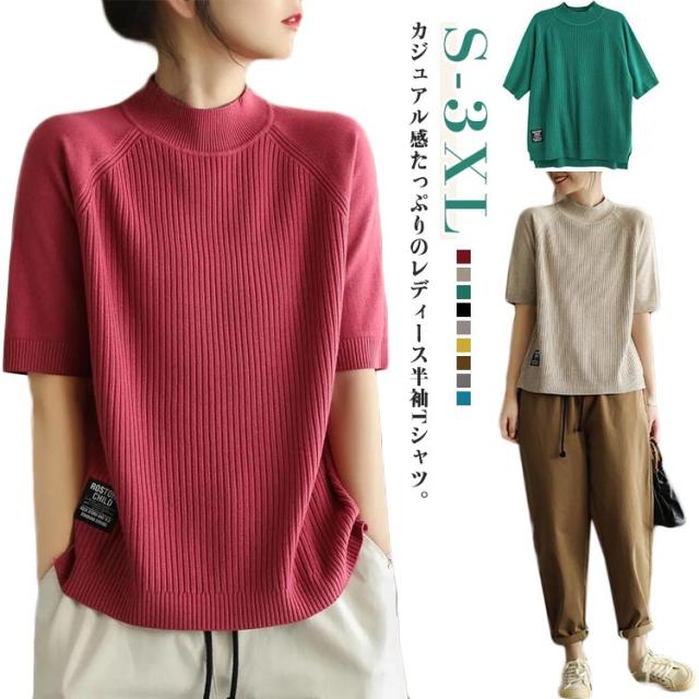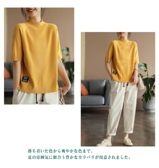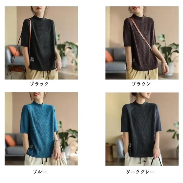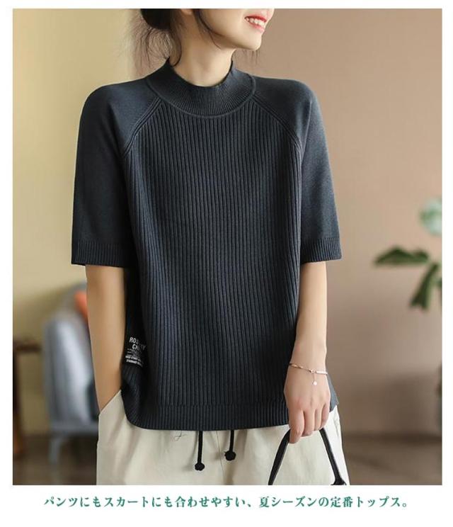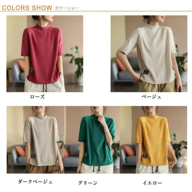五分袖 春 夏 カットソー リブニット 立ち襟 半袖Tシャツ ハイネック 半袖ニット プルオーバー モックネック レディース 部屋着 ルームウェア ショートスリーブ オフィス