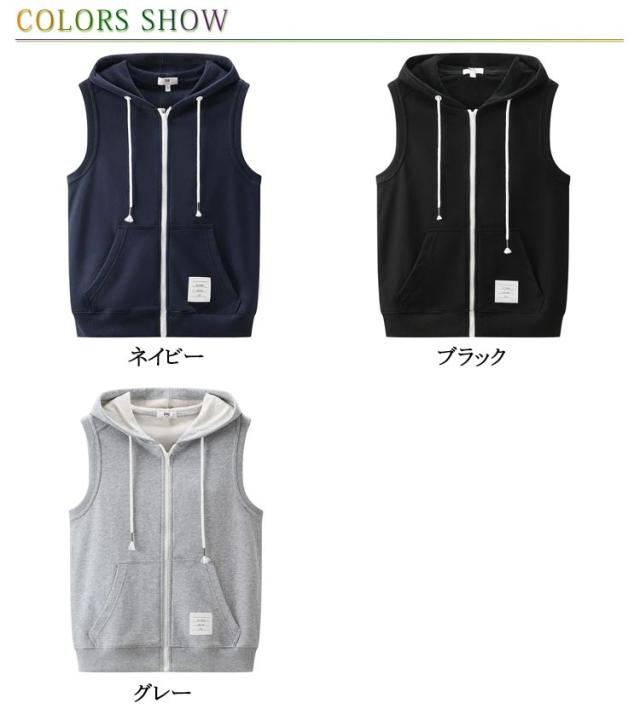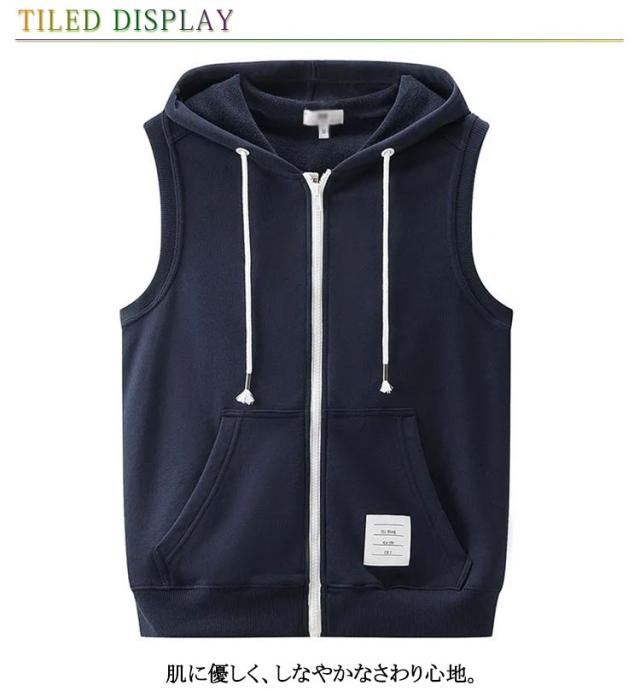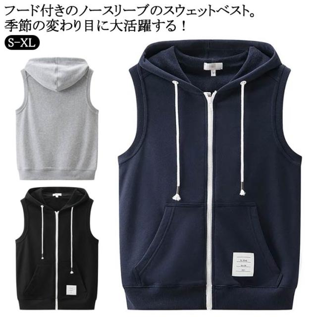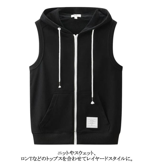 パーカーベスト フード付き スウェットベスト メンズ ポケット付き ジレ 前開きベスト ジップアップ ポケット付き レイヤード ポケット付き トップス ゆったり アウター 重ね着 ノースリーブ お洒落 大人 カジュアル 大きいサイズ 男性用ベスト カットソーベスト アウター