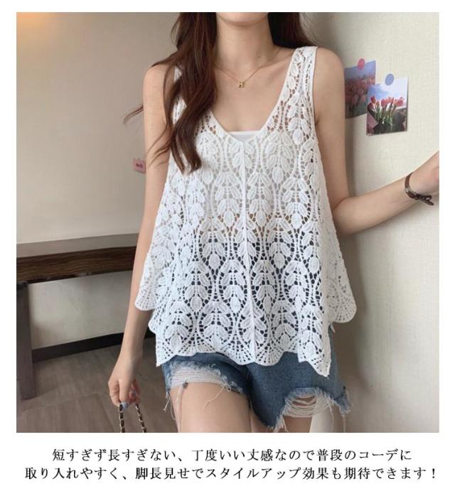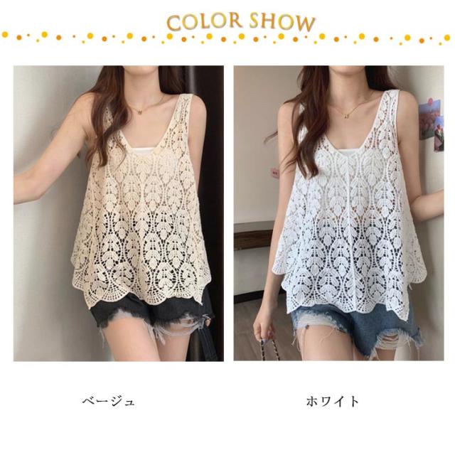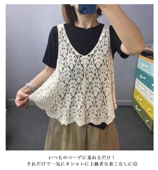 ベスト レイヤード プルオーバー トップス 重ね着 透かし編み サマーニット レディース 春夏 サマーニット レースベスト ニットベスト トップス 総レース トップス レース 体型カバー ゆったり お尻が隠れる 大きいサイズ 送料無料 ホワイト
