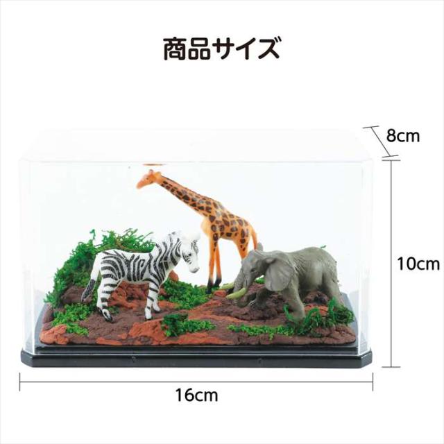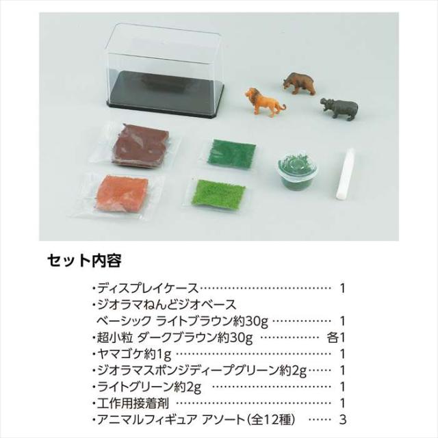 ■セット内容:ディスプレイケース×1、アニマルフィギュア×3、ジオラマ粘土ライトブラウン ベーシック(30g)×1、ジオラマ粘土ダークブラウン 超小粒(30g)×1、ヤマゴケ×1、ジオラマスポンジ(2g)ディープグリーン×1、ジオラマスポンジ(2g)ライトグリーン×1、工作ボンド10g×1