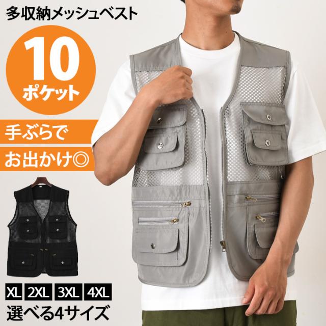 新作 手ぶらでお出かけ◎選べる4サイズ多収納10ポケットメッシュベスト メンズ ベスト メッシュベスト フィッシングベスト トップス メッシュ 前開き 大きいサイズ ポケット 収納 アウトドア キャンプ 釣り 作業