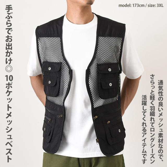 新作 手ぶらでお出かけ◎選べる4サイズ多収納10ポケットメッシュベスト メンズ ベスト メッシュベスト フィッシングベスト トップス メッシュ 前開き 大きいサイズ ポケット 収納 アウトドア キャンプ 釣り 作業