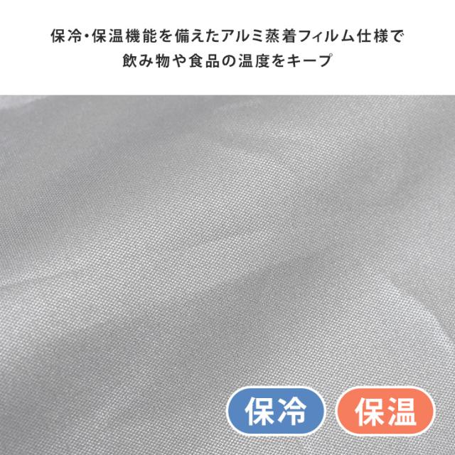 保冷・保温機能を備えたアルミ蒸着フィルム仕様で、飲み物や食品の温度をキープ