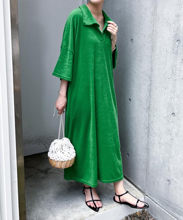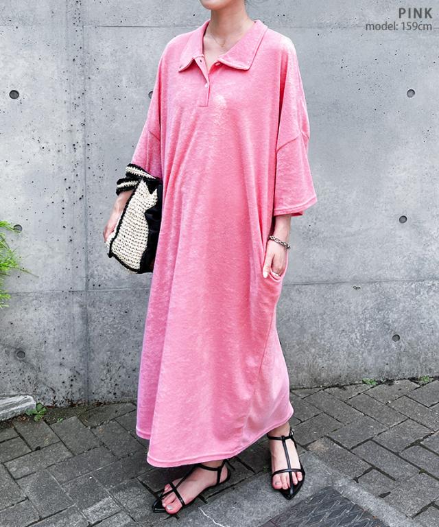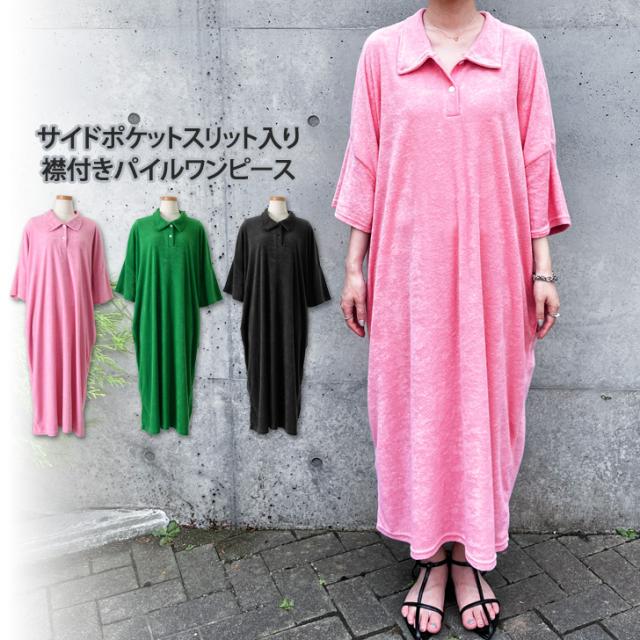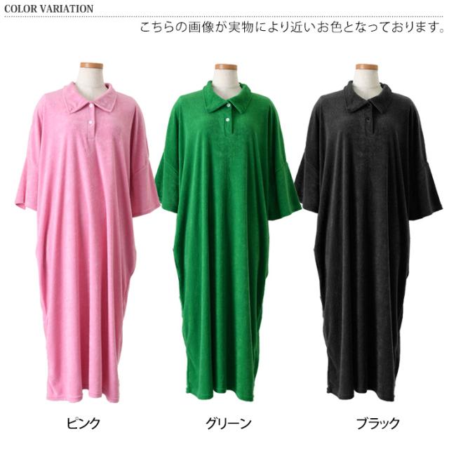新作 サイドポケットスリット入り襟付きビッグパイルワンピース レディース 夏 半袖 薄手 ロング丈 ゆったり 大きいサイズ ストレート おしゃれ カジュアル 膝下 体型カバー きれいめ 無地 リラックス 楽ちん