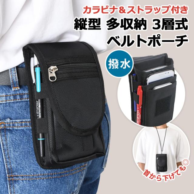 新作 カラビナ&ストラップ付き撥水縦型多収納3層式ベルトポーチ メンズ レディース ポーチ 小物入れ ベルトポーチ ウエストポーチ バッグ 3way カラビナ ネックストラップ 首掛け スリム スマホ 収納 軽量