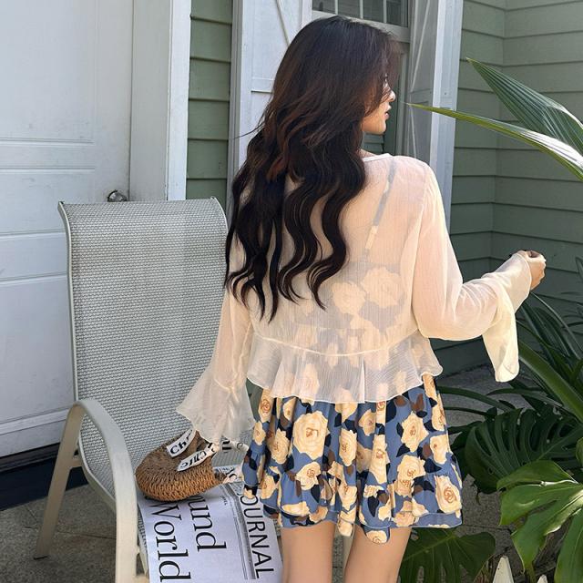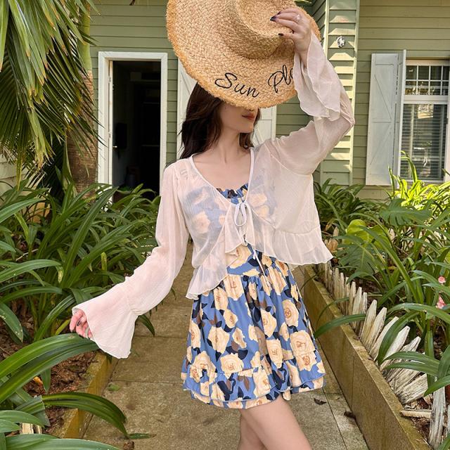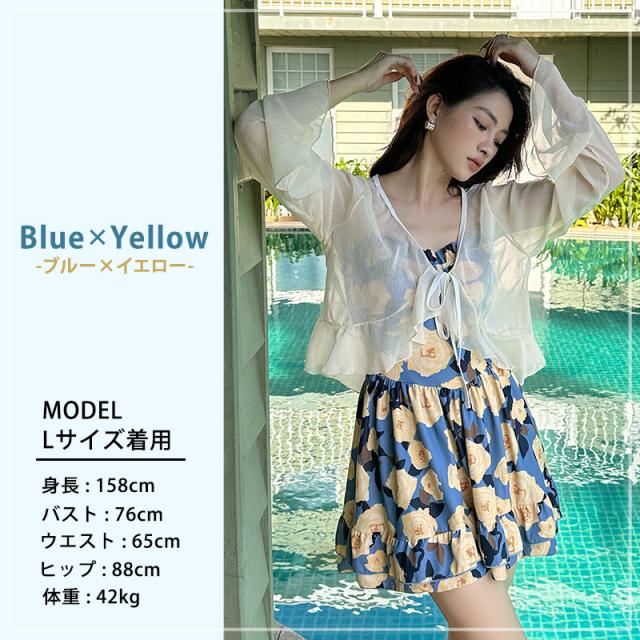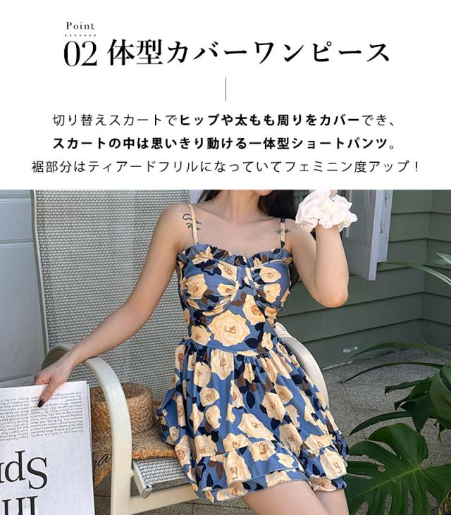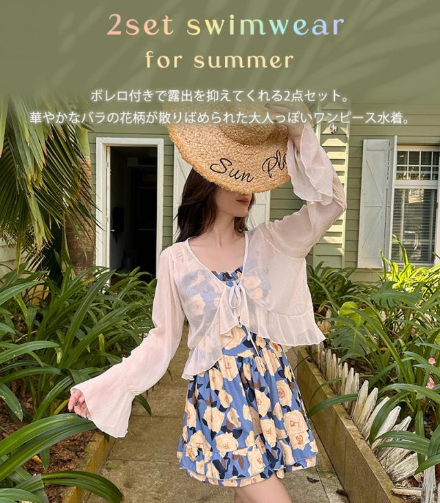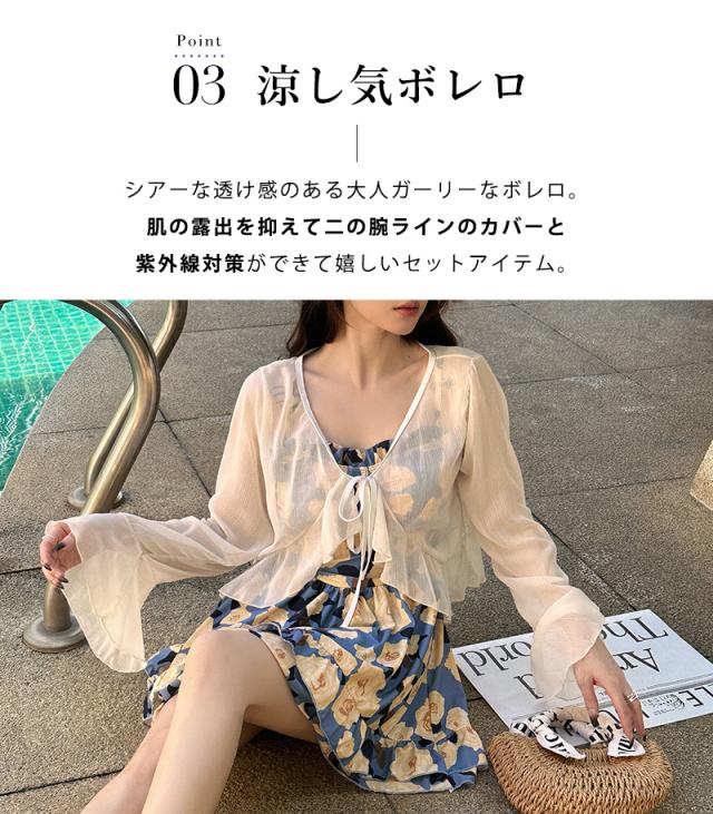夏新作 水着 ワンピース 体型カバー シースルー トップス 2点セット レディース パッド付き オールインワン ショート丈 ボレロ ノンワイヤー キャミソール ティアードフリル バスト 盛れる 二の腕 ウエスト ヒップ 太もも カバーアップ プラスサイズ