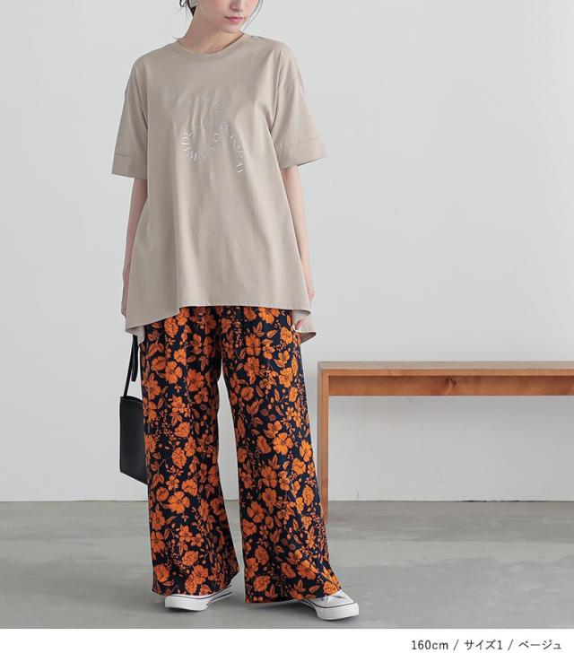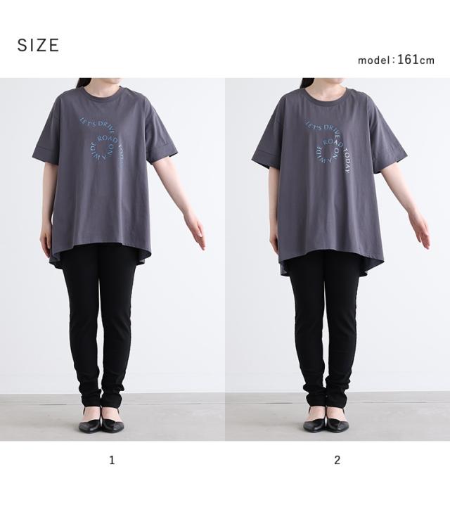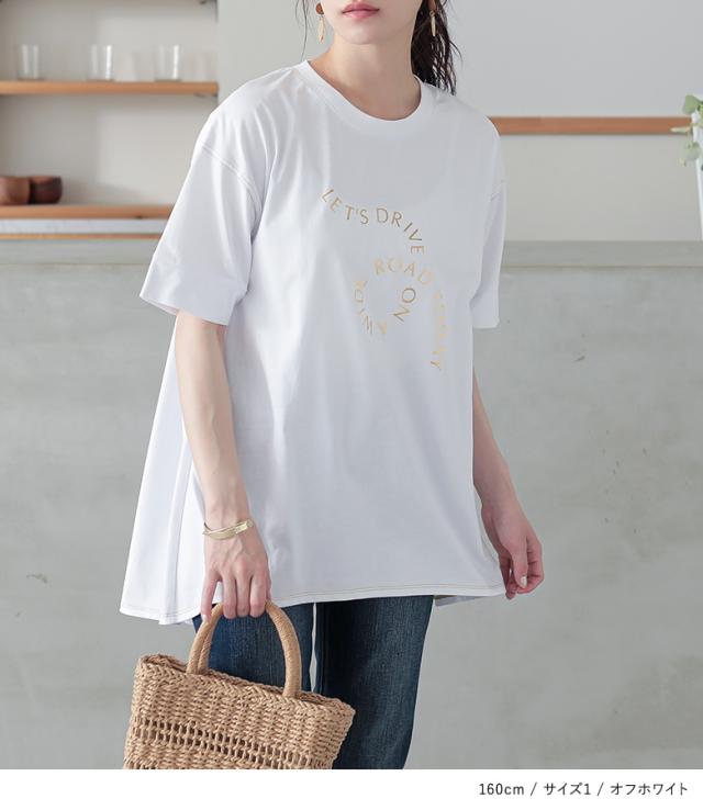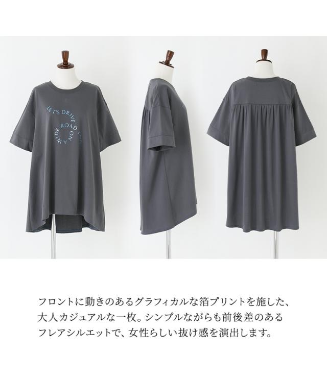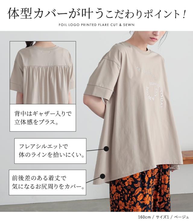 『箔ロゴプリントフレアカットソー』※メール便可※【10】[Tシャツ レディース トップス 半袖 箔 プリントT ロゴT フレア チュニック丈 折り返し袖 綿100% お尻が隠れる 春 夏]