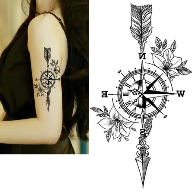 大きいサイズの花と弓矢と方位磁石をデザインした水で貼るフェイクタトゥーステッカー。