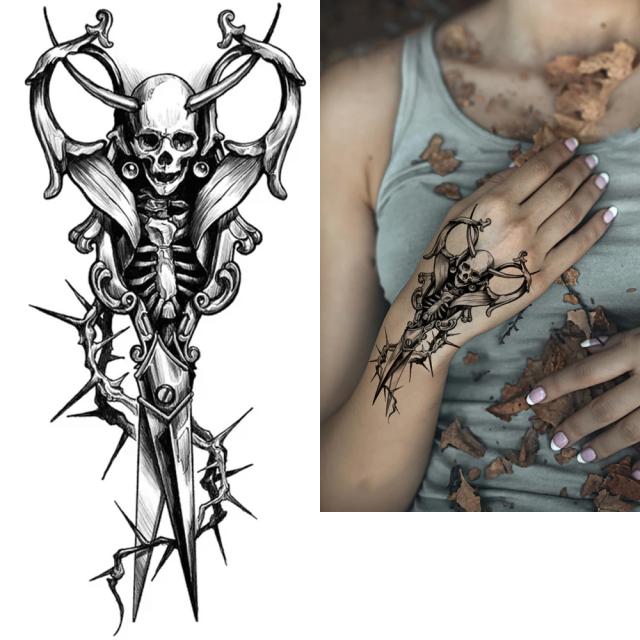 大きいサイズの茨にハサミと角のあるサタンスカルをデザインした水で貼るフェイクタトゥーステッカー。