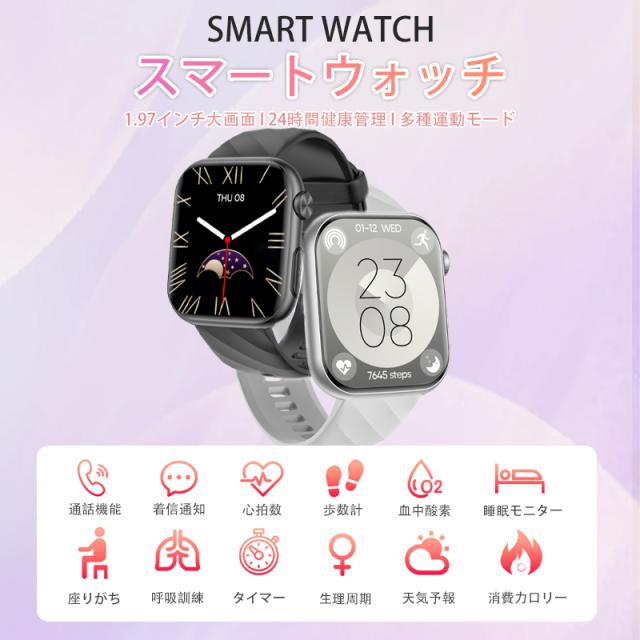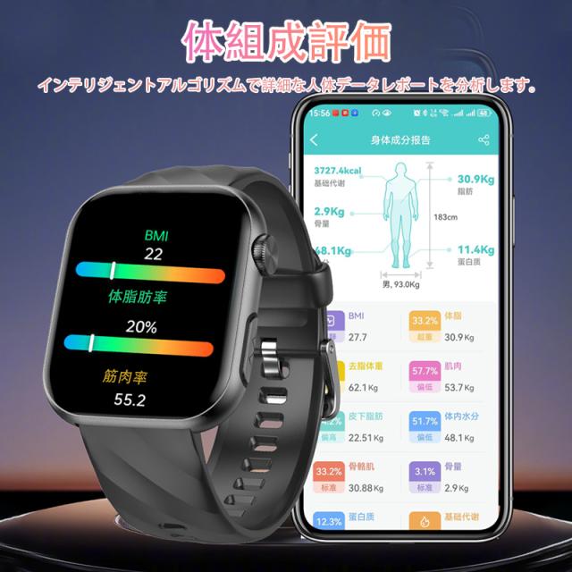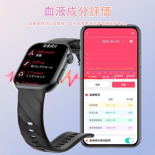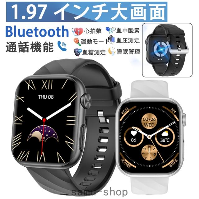 スマートウォッチ 日本製センサー 血糖値 血圧測定 血中酸素 脂質 睡眠監視 体温監視 ストレス監視 心拍数 活動量計 歩数計 iPhone Android対応 IP67防水 1.97インチ 天気予報 目覚まし時計 腕上げ点灯 音楽制御 座り過ぎ通知 リモートケア 音声アシスタント スマホ探し 日本語取扱説明書