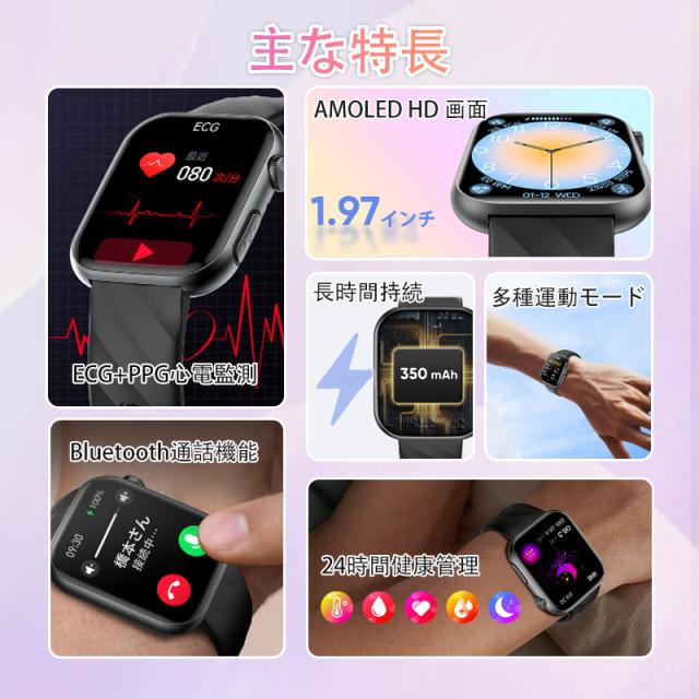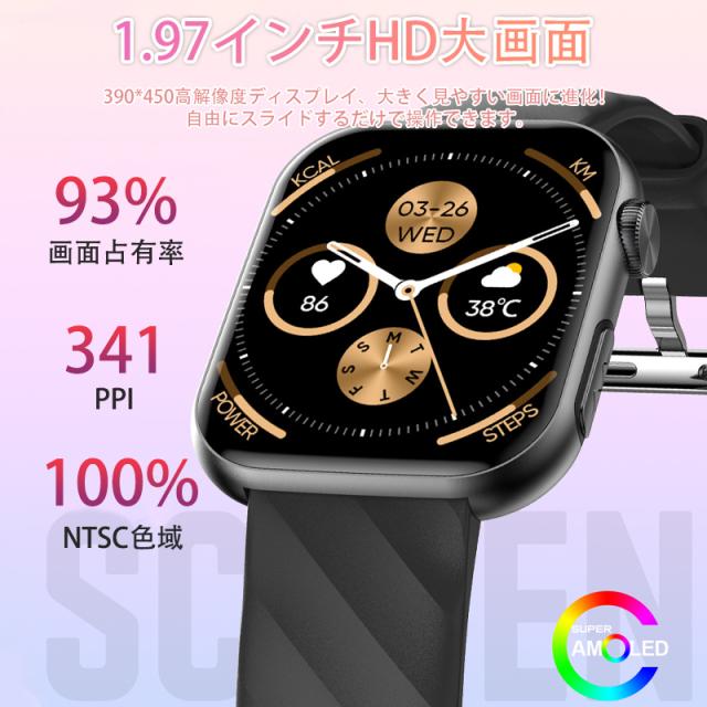 【1.97インチ大画面&多種類文字盤】HDの明瞭さで、健康とフィットネスの重要なデータを確認してください。3Dガラスの工芸に合わせて、より高い解像度の視覚体験とスマートフォンのようなタッチ触感を楽しめ、もっと便利に操作することができます。例のない快適な視覚感と優れた操作感をもたらし ます。多国の言語を自由に設定できます。更に、文字盤DIY機能もあり、携帯電話中の写真を利用して、お好きな文字盤を作る事もできます。毎日のお気持ちによって、新たな活力を注ぎます。好きな文字盤スタイルを取り替えましょう。