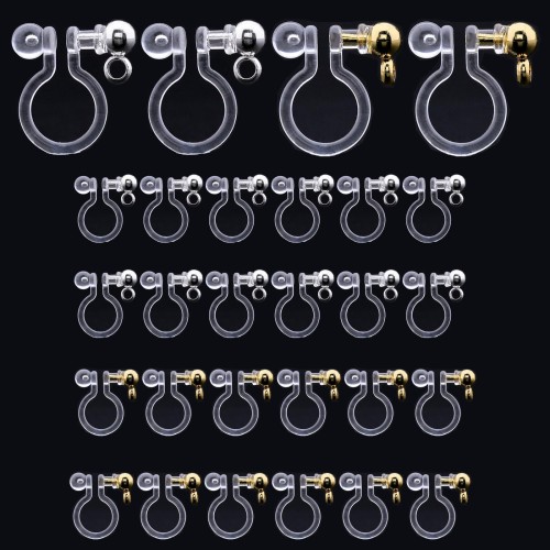 素材:樹脂、ステンレス セット:ゴールド10ペア(20個)、シルバー10ペア(20個) カラー:クリア・透明(本体)、ゴールド/シルバー(丸玉、カン付き) カン付きなので、お好みのチャームを合わせて、ゆらゆら揺れるイヤリングにお作り頂けます。 素材は樹脂で、金属アレルギーの方、ピアスの穴を開けていない方、通常のイヤリングが苦手な方、お子様にもオススメです。 ※耳たぶに挟むイヤリングでございますので、重たいチャームを付けますと耳から落ちてしまう場合がございます。