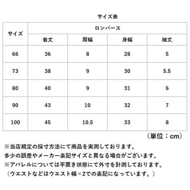 | サイズ | [ベビー] ・66cm ・73cm ・80cm ・90cm ・100cm ※サイズについて詳細は、商品画像の中にあるサイズ表をご覧くださいませ。 |