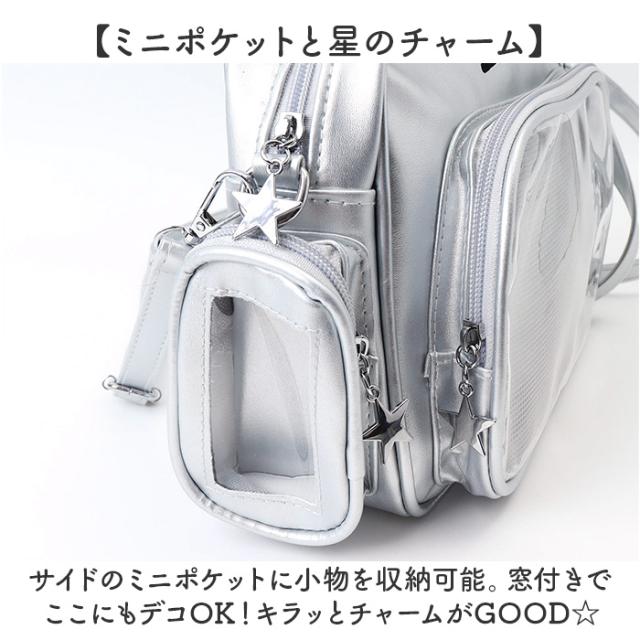 | 商品説明 | 【いろんな表情がCUTEなにゃんこ達♪】 ・自由にデコってお気に入りのバッグに☆「痛バッグ 猫 ショルダー」が登場。 【猫耳とかわいいフェイスが魅力】 ・ちょこんとついたお耳と、猫ちゃんの表情がたまらないキュートなデザイン!コーデの主役に♪ 【デコ窓付!お好みにデコレーション】 ・クリア窓にアクスタやバッチなど、大好きな推し活グッズをデコレーションできる優れモノ! 【初心者さんもデコしやすい!】 ・デコレーションしやすいバッジレイヤー仕様のシートつき。初心者さんも簡単にデコ☆ 【持ち方も自由な2WAY仕様】 ・ショルダーとリュックにチェンジできる2WAY。ハンズフリーでイベントやライブにぴったり! 【ミニポケットと星のチャーム】 ・サイドのミニポケットに小物を収納可能。窓付きでここにもデコOK!キラッとチャームがGOOD☆ 【ポケット仕様】 ・サイド:窓付きポケット×2 ・フロント:デコ窓ポケット×1 |