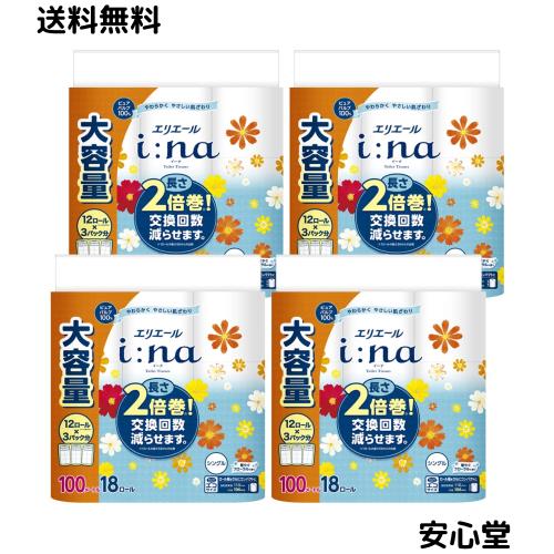 エリエール トイレットペーパー i:na(イーナ) 2倍巻き 100m×72ロール (18ロール×4パック) シングル パルプ100% 華やぐフローラルの香り