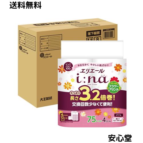 ◆商品名:エリエール トイレットペーパー i:na(イーナ) フラワープリント 3.2倍巻き 75m×32ロール(4ロール×8パック) ダブル パルプ100% 華やかな