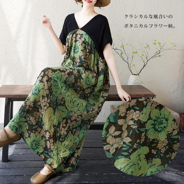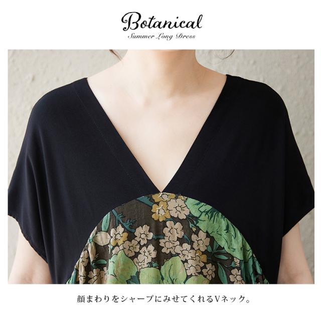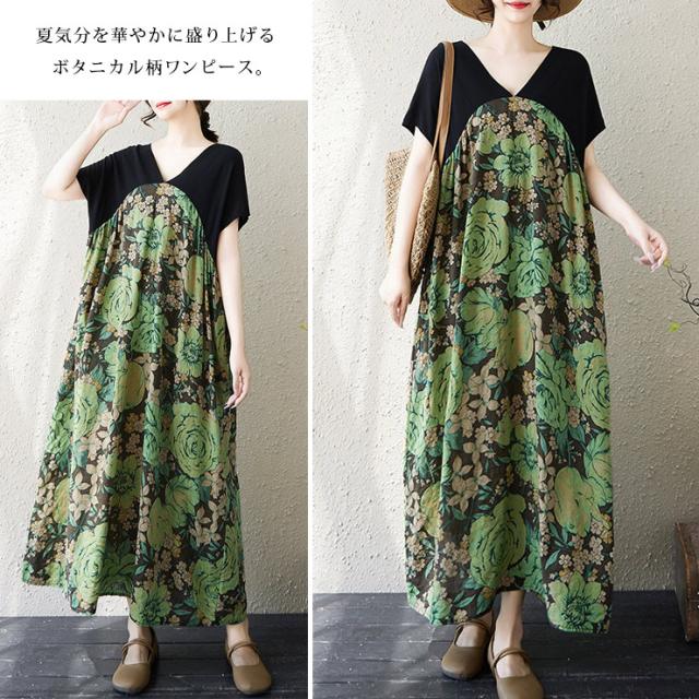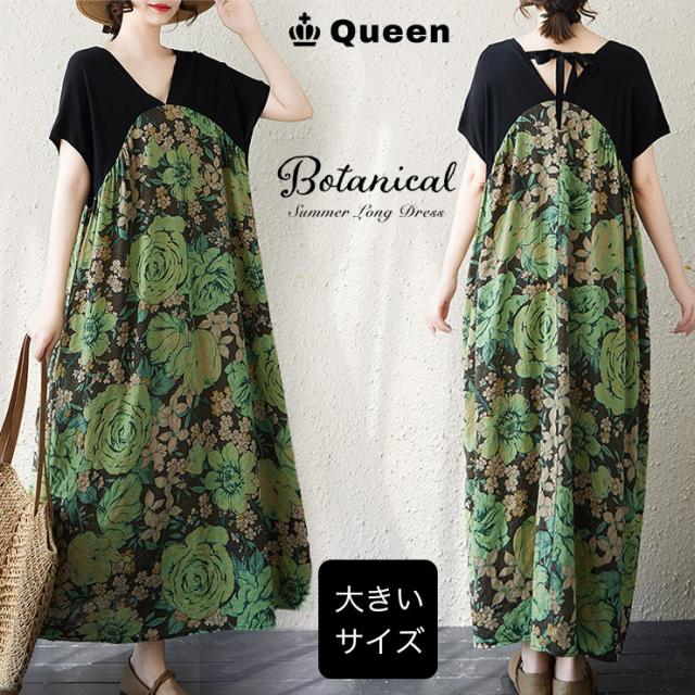 ★☆ワンピース 大きいサイズ ボタニカル柄 ロング丈 花柄 切替デザイン ゆったり 体型カバー Vネック ポケット付き 春夏 リゾート風 LL 3L 4L 5L 6L カジュアル 部屋着 リラックス☆★