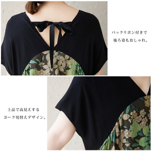 ゆったり着られて華やかに映える、大人のボタニカルワンピース。背中リボンと切替デザインがアクセント。