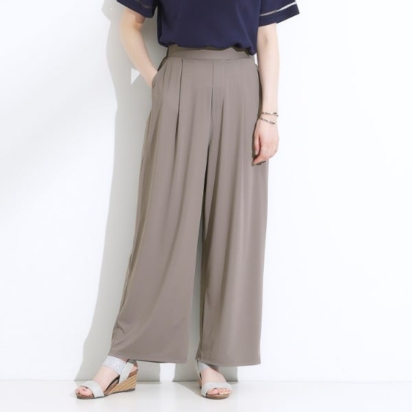 ひんやりとした、リラックス感のある素材感のワイドシルエットパンツ。