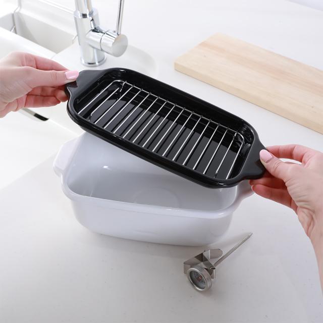油を切るすのこ網とバット付きで、初めて揚げ物をする方にもおすすめです。バットはオーブン皿としても使えます。 | 角型だから油を移しやすい