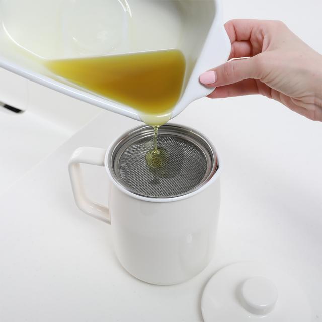 角型天ぷら鍋のコーナーを活かせば油の移し替えも簡単です。オイルポットにスムーズに移すことができて後片付けも楽チン。ホーロー製品はガラス質なので表面がなめらか。匂いがうつりにくく、油汚れもサッと落とせます。温度計以外は食洗機対応可能です。