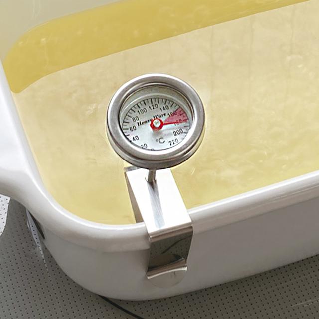 富士ホーローの角型天ぷら鍋は、クリップ付きでしっかりとめられる温度計付き。揚げ物に最適な160℃〜180℃は赤く表示されているので揚げ頃がわかりやすくベストなタイミングを逃がしません。防水型なので水洗いも可能です。(食洗機はNG) | 温度計のご使用方法