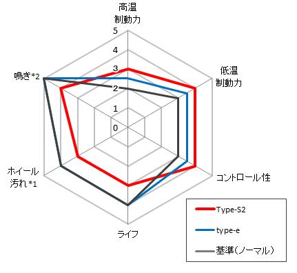 | 種類 | 高温制動力 | 低温制動力 | コントロール性 | ライフ | ホイール汚れ*1 | 鳴き*2 |