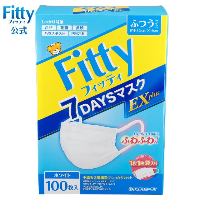 マスク フィッティ 不織布 ふつう 個包装 プリーツ 100枚入 7DAYSマスクEXプラス ホワイト かぜ 花粉 黄砂 ハウスダスト PM2.5