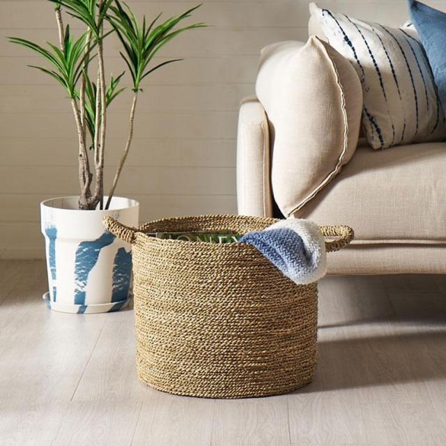 直径40cmと間口が広く物の出し入れも楽々。天然素材シーグラスの大容量のバスケット。雑誌やブランケットなどを優雅に収納できるだけでなく、ランドリーバスケットとしても活躍。整った空間で優し時間を楽しむことができるアイテム。モダンでありながら自然とのつながりを感じさせるデザインは、リラックスした心地よい暮らしを演出。手編みの温かみと優しい色合いは、まるでサーフスタイルやホテルライクな空間に調和するかのように、どんなインテリアにも馴染みます。