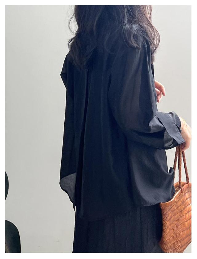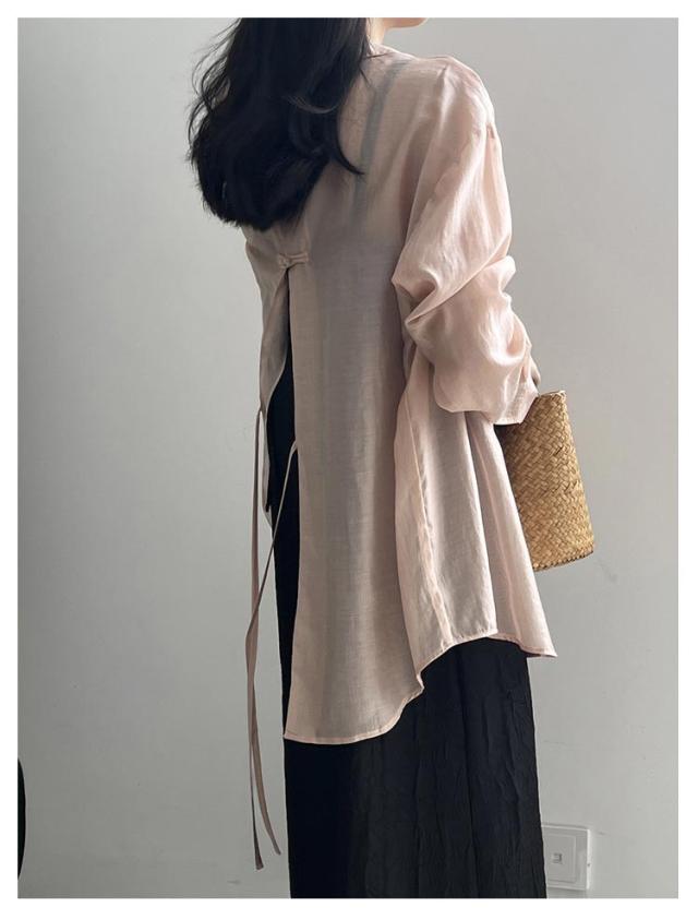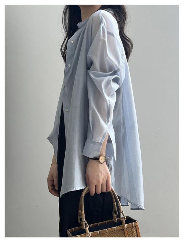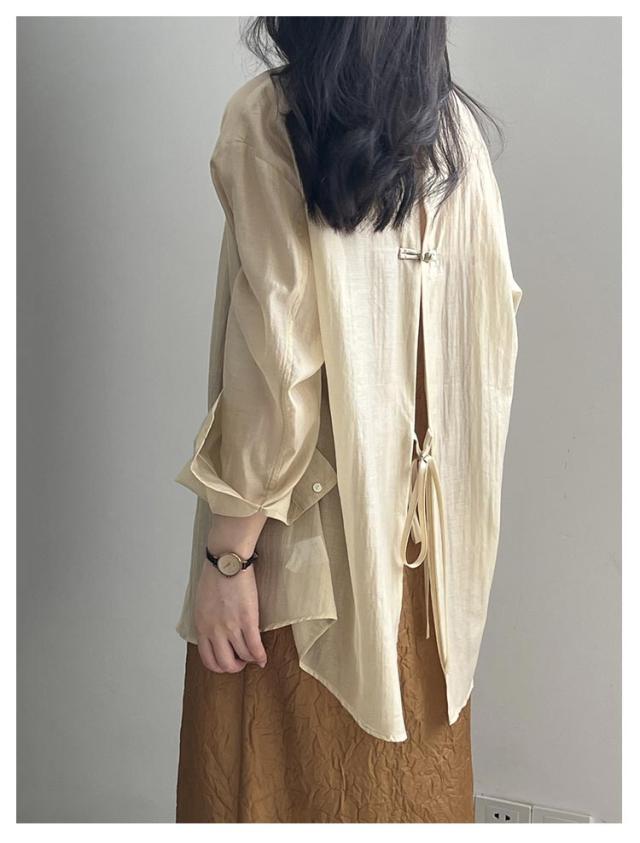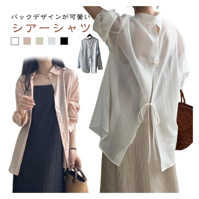 シアーシャツ レディース バック 長袖 透け感 薄手 チャイナボタン シースルー 紫外線対策 冷房対策 UVカット 羽織 大人可愛い 韓国風 人気 トレンド 20代 30代 40代 きれいめ 無地 シンプル お出かけ デート おしゃれ 通勤 送料無料