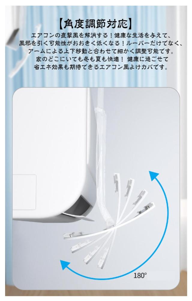 | エアコンの直撃風を防ぐ!3つの風車付きでエアコンの風を循環! エアコンがオンになると、密集した出風孔を通じて、部屋内に均一に流通する,直撃風を部屋に分散させ、室内の温度は「暑い」や「寒い」ことがなく、エアコン病、風邪、頭痛などを予防し、快適な室内環境を作ることができます。 【取付け簡単】取り付けが便利です。ぶら下げ式ので、穴あけ不要で、壁を破らない!取付け方法:1.ボタンをパネルに通して、それぞれ2本の支柱を接続する。2.透明ロッドを鋼管に挿入する。3.鋼管をそれぞれ支柱に挿入する。5.透明フックをエアコンの上部に掛けて、適切な角度を調整する。 【多機種対応&夏も冬も快適に過ごせる】さまざまなニーズに対応でき、調節しやすく、使いやすい。冷暖房兼用で、ほとんどの家庭用・共用エアコン機種に対応。エアコンの風が直接当たることによる冷えや乾燥を防ぐ役割を担っています。風除けで分散された風が部屋全体に広がり、室温が均一に整いやすいのが特徴です。「ここは寒い」「ここは暑い」等の温度ムラを軽減します。 【角度調節対応】エアコンの直撃風を解消する!健康な生活を与えて、風邪を引く可能性がおおきく低くなる!ルーバーだけでなく、アームによる上下移動と合わせて細かく調整可能です。家のどこにいても冬も夏も快適! 健康に過ごせて省エネ効果も期待できるエアコン風よけカバです。 | |