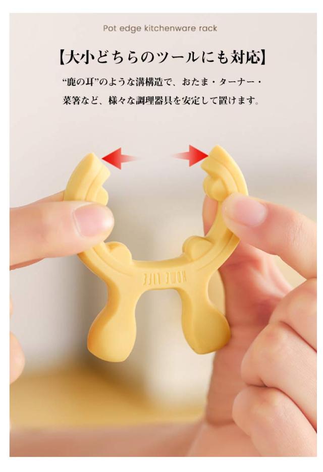 | 【3個セット】シリコンキッチンツールスタンド 鍋縁に挟める多機能スプーンホルダー|省スペース・高耐熱・台所便利グッズ 調理中の“ちょい置き”に困らない! 鍋のフチに挟むだけで、おたまやヘラをしっかり固定。省スペース・衛生的なキッチンを叶える多機能ツールスタンドです。 材質:シリコン(耐熱温度:230℃) 【鍋縁に挟むだけの簡単設計】 シリコンの弾力でしっかりフィット。鍋のフチにワンタッチ装着でき、調理中のツール置き場として大活躍。 【スペース節約・台面汚れ防止】 作業台を汚さず、スッキリ清潔。スプーンやヘラを立てかけたまま両手が自由に使えます。 【大小どちらのツールにも対応】 “鹿の耳”のような溝構造で、おたま・ターナー・菜箸など、様々な調理器具を安定して置けます。 | |