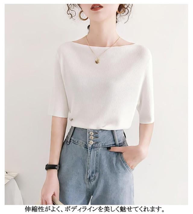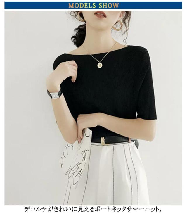 送料無料 サマーニット アイスシルクセーター レディース トップス 無地 ボートネック アイスシルク リブニット 大人 五分袖 半袖 tシャツ ショート丈 ニットソー 着やせ トップス プルオーバー ライトニット 接触冷感 涼しい