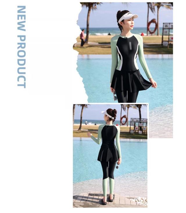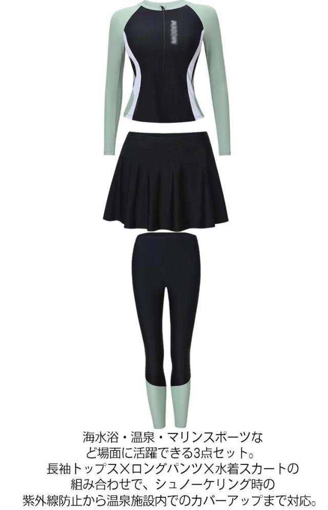 | 胸パッド付き水陸両用・ラッシュガード水着3点セット。 海水浴・温泉・マリンスポーツなど場面に活躍できる3点セット。長袖トップス×ロングパンツ×水着スカートの組み合わせで、シュノーケリング時の紫外線防止から温泉施設内でのカバーアップまで対応。 長袖トップスは取り外し可能な胸パッドを内蔵し、スポーツ時にも自然なバストラインをキープ。 嬉しいショートスカート付き、腰周りと太ももを覆うことで、気になる部分を適度に覆いながら、軽やかな印象をキープ。 | |